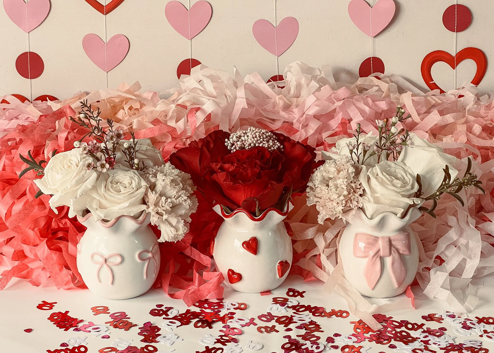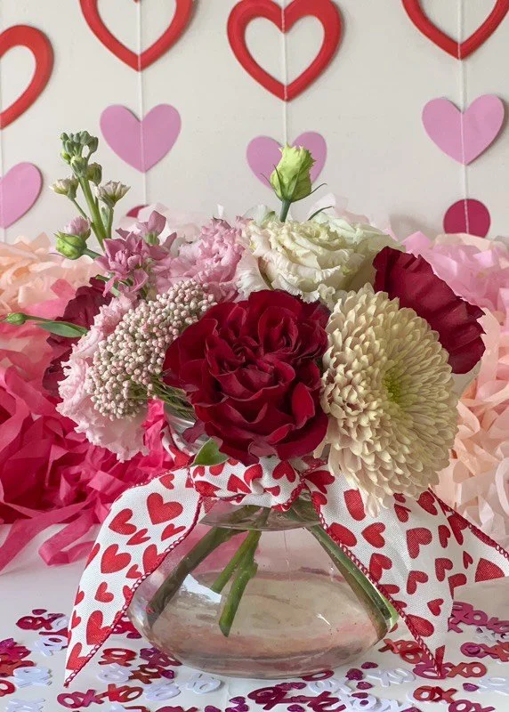Filled with BLOOMS in pinks, reds, and whites, this simple classic vase will surely impress your special Valentine!