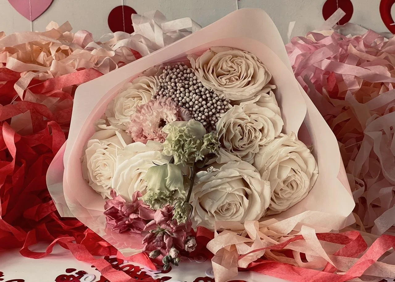 Wrapped with Love! Dressed up a little more for your special someone, this flower bunch will feature reds, pinks, whites and greens, the perfect surprise for your loved one!